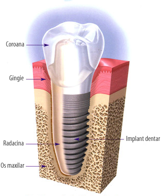 Implantologia se rezuma la "inlocuirea radacinii naturale cu o radacina artificiala din titan" si serveste ca suport pentru realizarea de coroane sau punti dentare atunci cand dintii lipsesc. Obiectul final este de a inlocui dintii lipsa si capata aceeasi functie ca dintii naturali.